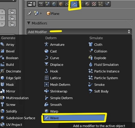 A este plano, estando en object mode, vamos a añadirle un modifier de tipo wave.