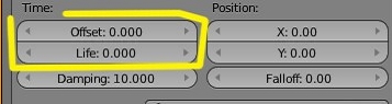 Sobre la línea de tiempo hay que decir que mientras esté en cero, se repite constantemente. Si, por ejemplo, queremos que empiece en el frame número 10 solo tendríamos que cambiar el valor de offset y ponerle 5. Y sí, por ejemplo, quisiéramos que durara 50 frames, pues ese es el valor que le tendríamos que poner en el valor life (vida).