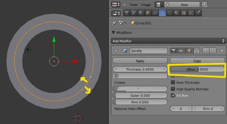 Luego tenemos offset. Con offset sí, por ejemplo, lo ponemos a valor 0.0000 es que la malla quede en el centro y que el crecimiento o solidificación del objeto se reparta tanto hacia el interior como el exterior.