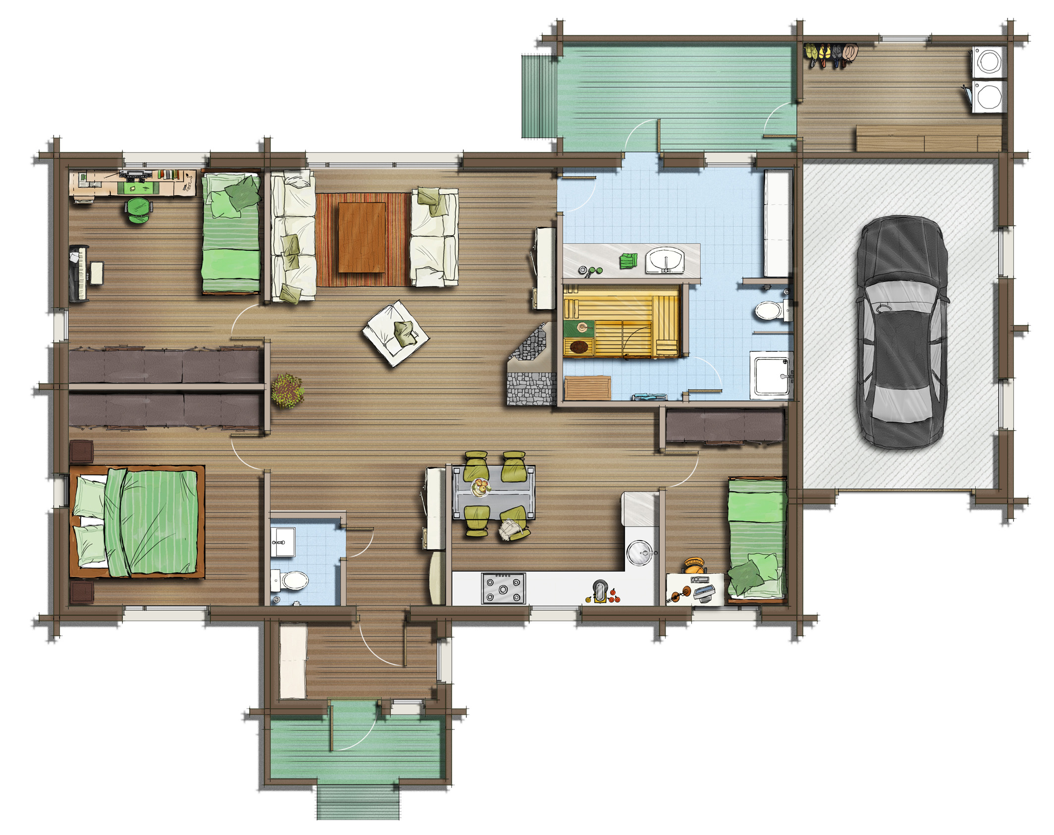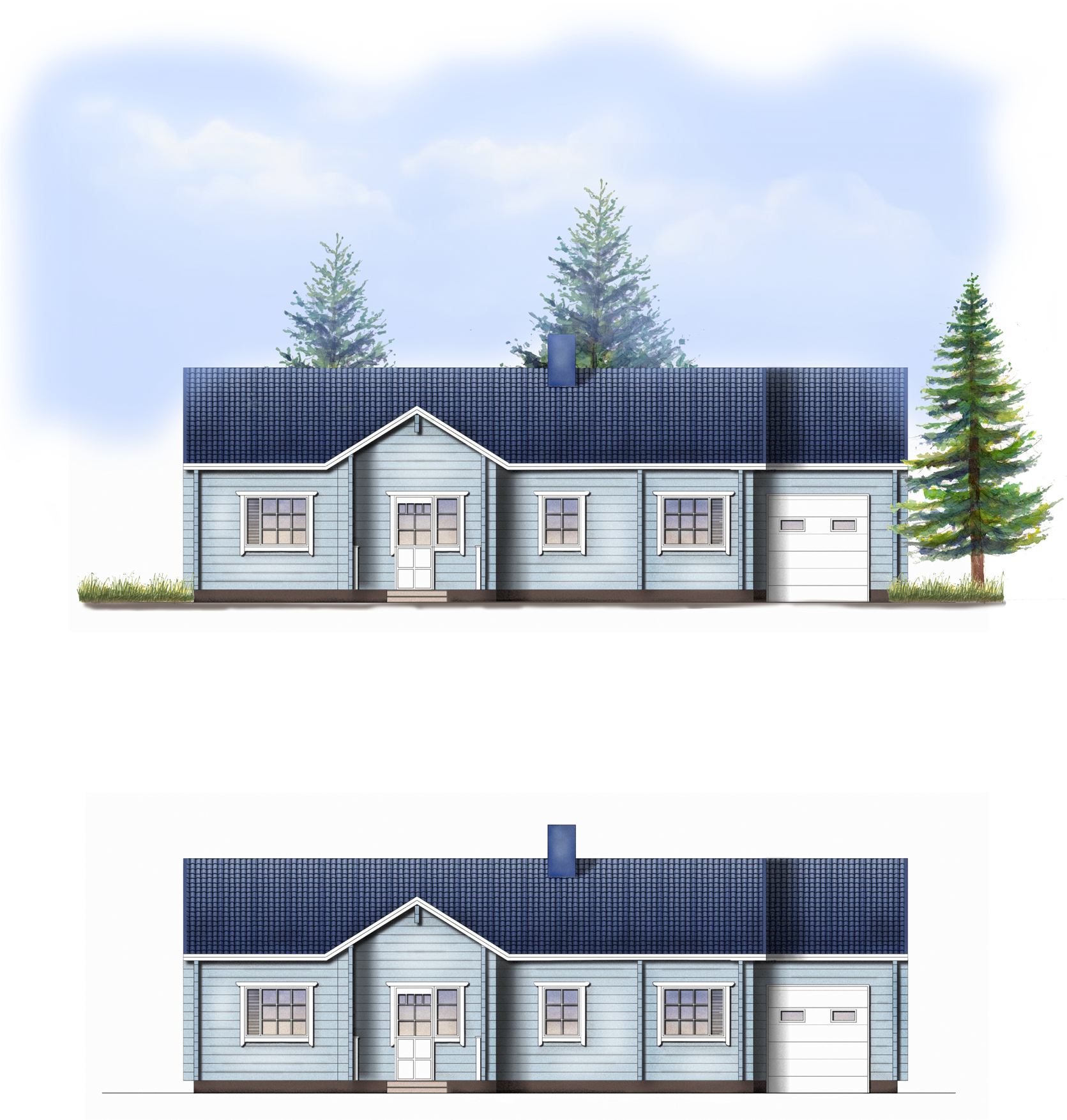 Plano comercial + elevación frontal, para un fabricante de casas filandesas. Realizado con Adobe Photoshop. Talens2d@gmail.