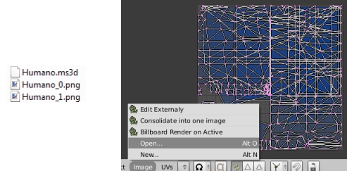 Seguimos con la malla seleccionada para cambiar a modo edición. Desde una de las ventanas de Blender en el tipo UV/Image Editor vemos cómo se encuentra desplegada la malla en el mapa de coordenadas de la textura, vemos que existen áreas superpuestas. De momento, le asignaremos la textura principal (la que termina en _0) para comprobar que partes de la malla no están mapeadas correctamente. Las texturas en formato (*.png) se encuentran en el mismo directorio que el archivo de la malla.ms3d, con el mismo nombre que el modelo al que se le a añadido un número de orden.