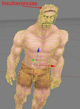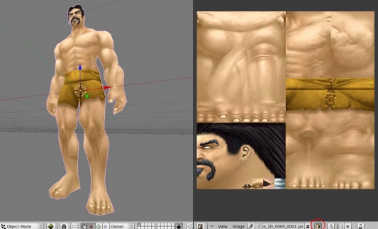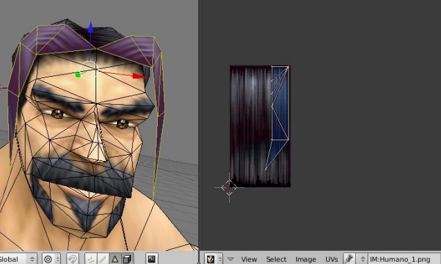 Una vez seleccionada un área, abrimos la segunda textura (en este caso humano_1.png) y, aunque los cambios son visibles desde la ventana 3d, la ventana del UV/Image Editor muestra la textura anterior. Esto es debido a que he seleccionadoparcialmente una isla del mapa de coordenadas y existen caras aplicadas sobre ambas texturas. Luego podremos ir seleccionando individualmente las caras no seleccionadas desde la ventana 3d y cambiarle la textura cómo se muestra a continuación, seguimo modificando más áreas, pero esta vez después de la selección sólo seleccionamos la textura del cabello desde la lista de texturas.