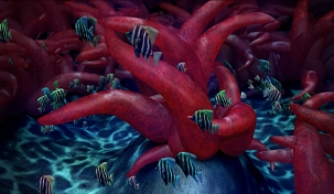 The lighting con-sists of a Hemi Light situated behind the Cam-era which gives the underwater Camera light ef-fect. Basic ambi-ent Occlusion and Mist todo en-hance the shad-ows with the AO set todo a blue clouds, give the underwater fel, then two spot lamps with a caustic texture map todo create the feeling of light coming th rouge the ocean surface. Finally a few Low level lamps todo lighten up a few áreas, all of the textures are pretty much just a color map and a Bump map with the exception of the stalks of the anemone. The stalks are Many layers of procedural TeX-tures with Subsurface Scattering turned on. This part is very much a trial and error procedure until you get the look you want.