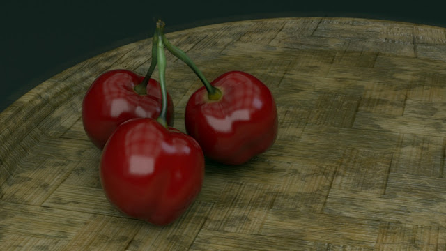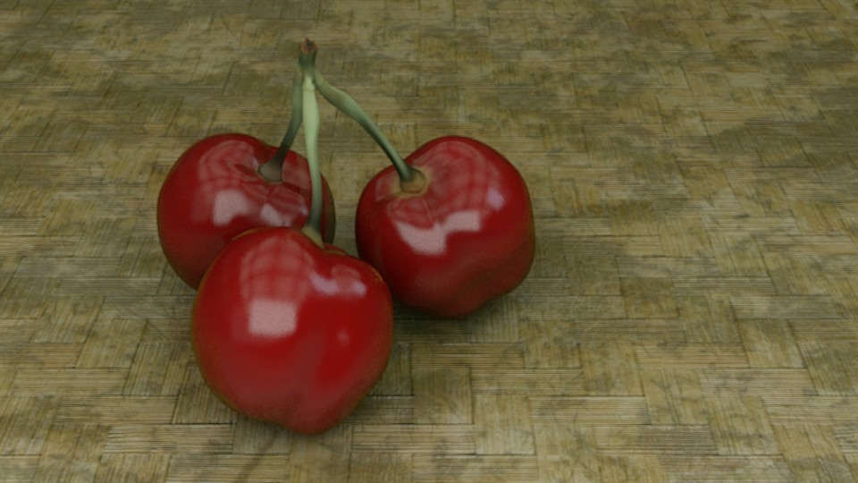 Ya sé que solo es una prueba de materiales, pero creo que el rabo es muy pequeño comparado con las cerezas. Debería de ser más largo y su textura más viva y verde.