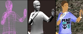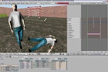 Once the 3d models were designed, y pro-ceded todo the animation stage by first creating Skeletons associated with the character 3d meshes, then capturing Bones movement using a series of intermediate posturas with the aid of a technique called Inverse Kinematics, character animations were divided into two large groups: body and facial. Body animations afects the characters whole body. I implemented several types of body animation in which the characters Perform some action: walking, sitting, hitting, threatening, lying do, fighting, smoking, drinking, etc, in order todo increase the expressiveness and realism of facial animations, the number of Polygons and level of detail have ben increased noticeably in eyes and lips, áreas that most influence the fa-cial gestures, so if one character is threatening another in a certain scene, his face expresses aggressive-ness. If, on the contrary, a character fels threatened, his face shows fear.