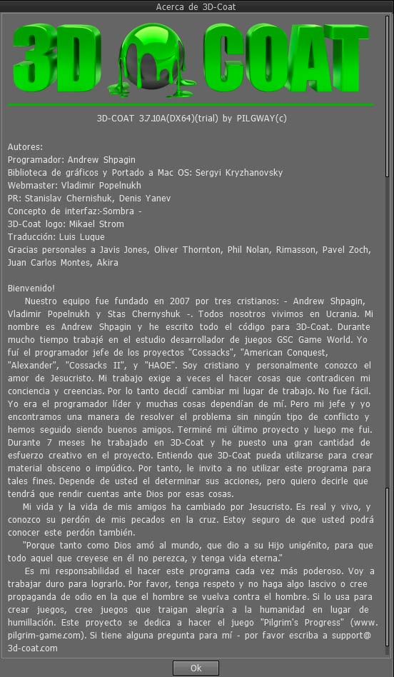 Lo que me resultó curioso del 3DCoat es el acerca de, con el comentario del autor que decía algo así, como es cristiano, pues que no se use el 3DCoat para hacer nada impudico, ni libidinoso.