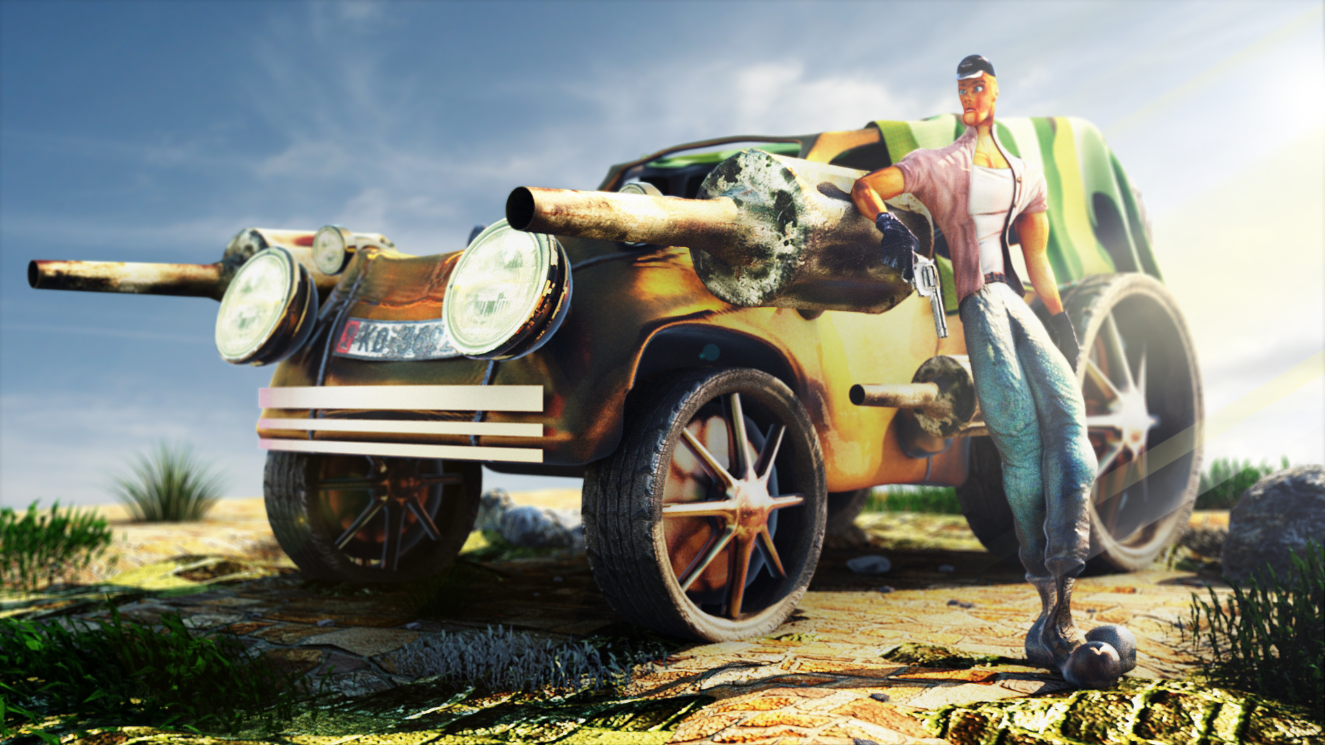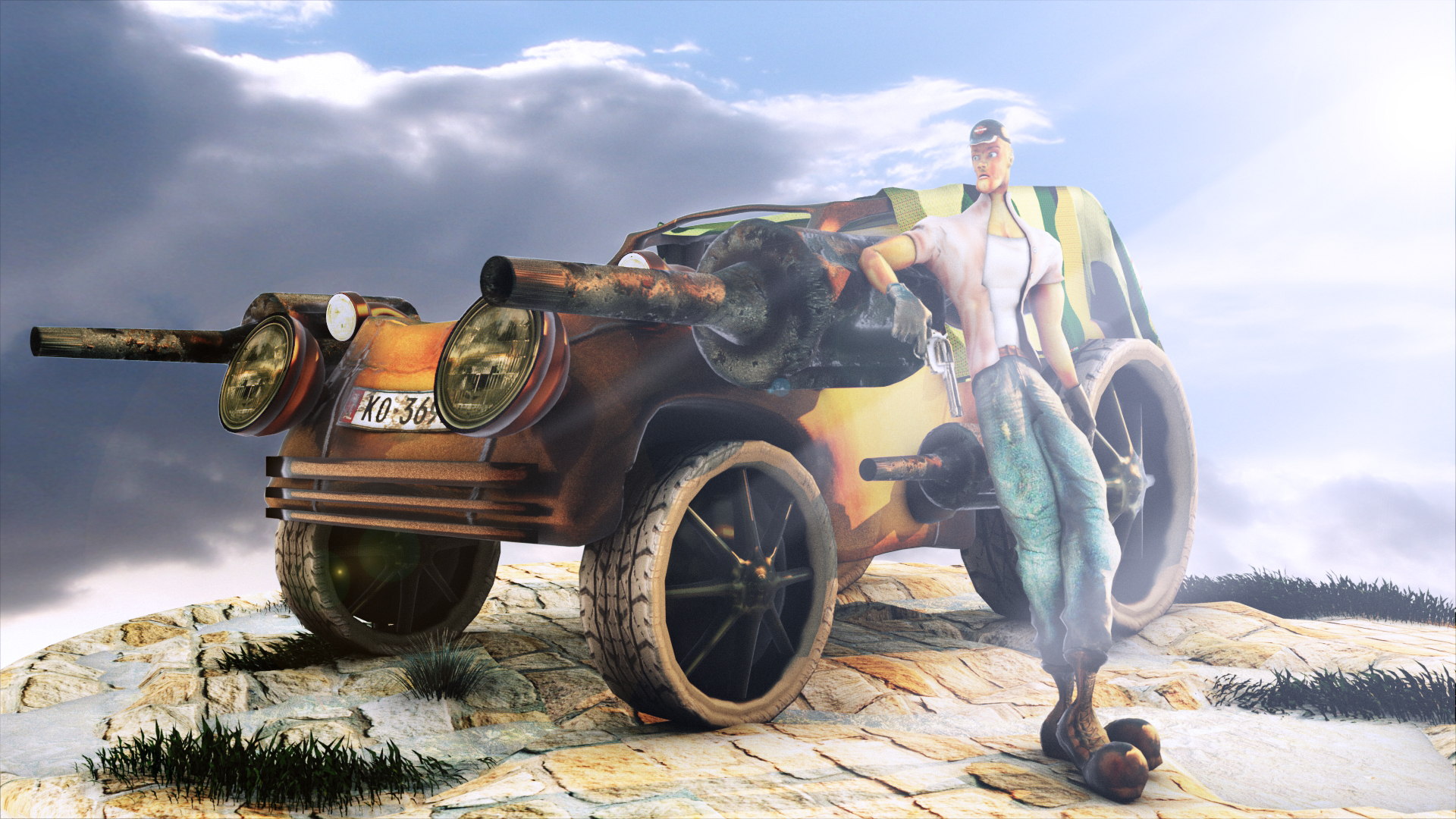 A nivel de modelo esta bueno, pero creo que la parte derecha de la imagen está un poco velada, tiene una sobre-exposición que le quita naturalidad. El texturizado si está en debe: lo siento demasiado plano, y los cañones necesitan urgente un UVW porque la parte del frente está demasiado corrida y se ve feo, las ruedas podrían estar más sucias, además que te ha quedo muy facetadas, ponle un smooth. Se ve raro la gorra del personaje, esta como parte de la texturam creo, mejor hubiera quedado modelada, y los faros no se ven bien, se nota que es una fotografía puesta flipeada y hay mucha diferencia con el resto del acabado.
