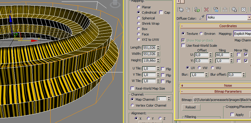 Ya que es un patrón que se repite quiero ponerlo al objeto e ir aumentando la cantidad de repeticiones del motivo con Tile o similar. Pero no sé qué tipo de mapeado se puede poner para que se vaya adeptando a la forma anular. Gracias y un saludo.