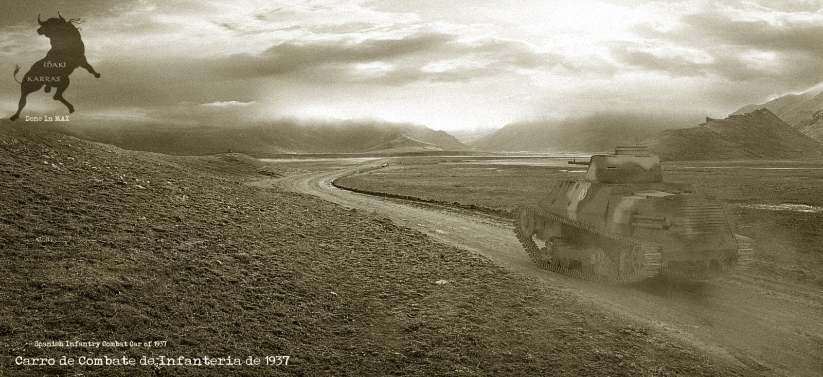 Aquí dejo al chismín, yendo sólo por el árido altiplano, aunque el paisaje creo que es Escocia, parece también el típico asturiano. Corregido la inclinación, con el humo del escape y el polvo del camino. Así de paso medio borro las huellas.