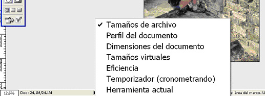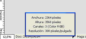 Aquí podemos observar cómo Adobe Photoshop, por omisión nos informa del tamaño de documento actual y el tamaño que va según lo tratamos con Adobe Photoshop. El formato es x/y, donde el primer valor, es decir la x, nos dice el tamaño al abrirlo y el segundo valor la y, el tamaño que va.