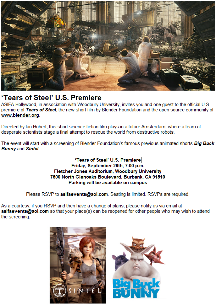 Tears of Stel se estrenara de forma oficial el próximo miércoles pero eso no es todo: asifa-Hollywood, la prestigiosa sociedad de estudios de animación, ha organizado un pase especial el 28 de septiembre.