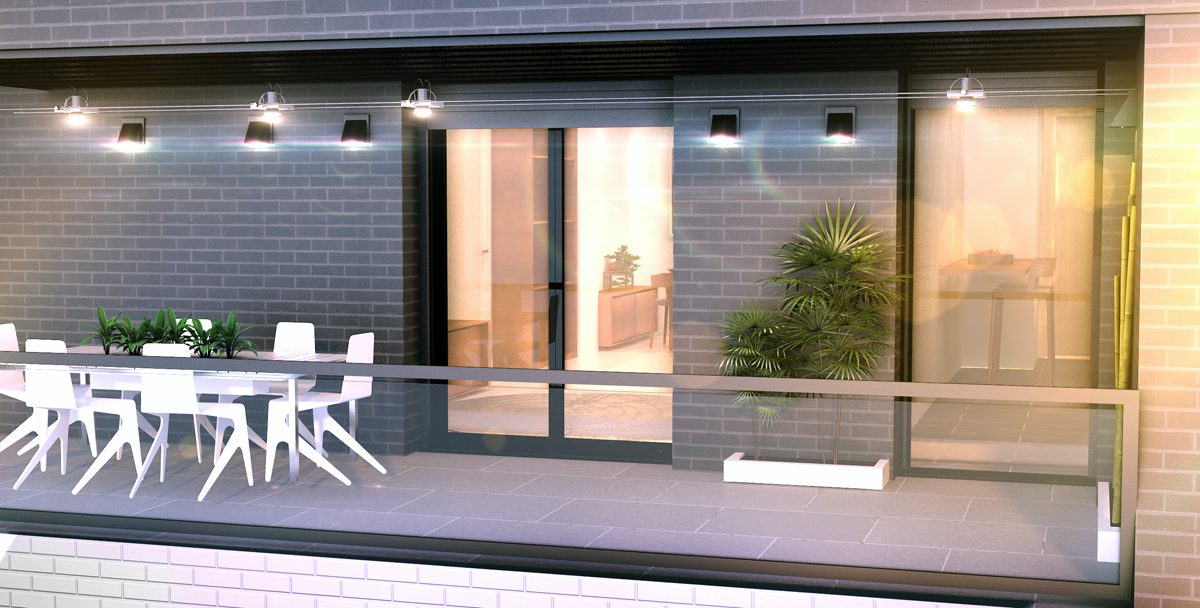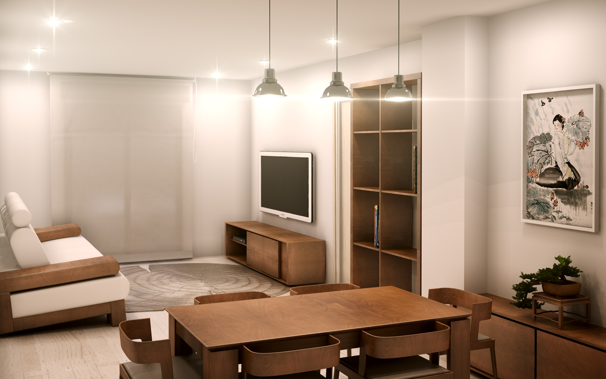 6° veo que el living tiene balcón. Toman mucha presencia las luces, eso hace que se te desvalorice tu trabajo y las texturas y materiales. Y en un balcón no metería una mesa para 6 personas, como mucho una mesa redonda y 2 reposaderas. A los ladrillos le falta Bump y displace.