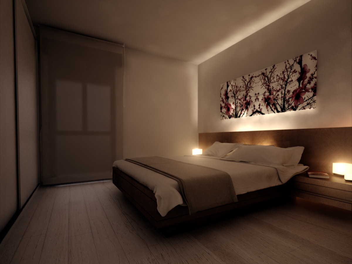 7° habitación, por atrás de la pared viene la luz? De ser así, apaga los veladores, así toman mayor importancia esas luces. La cortina va arriba de la terminación de la ventana, no hasta el techo, y la subiría un poco y mostraría un poco afuera.