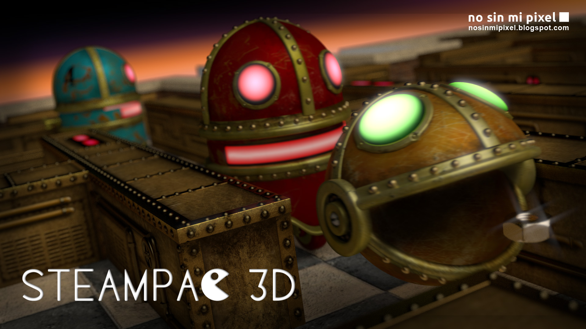 Hola a todos, me paso por la sección de trabajos finalizados con un render hecho con Blender y Cycles para ilustrar un videojuego arcade en el que he estado trabajando últimamente (steampac 3d) y que ya está disponible para su descarga en sourceforge de manera libre.