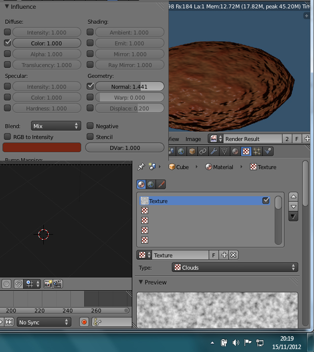 Para lo que tiene volumen se utiliza primero el modelado y luego puedes mezclar lo que es el material (pones un color parecido) con texturas. Qué bien puedes ser texturas procedurales como clouds u otra o también utilizar texturas de imagen de lo que busques (por ejemplo, de la carne).