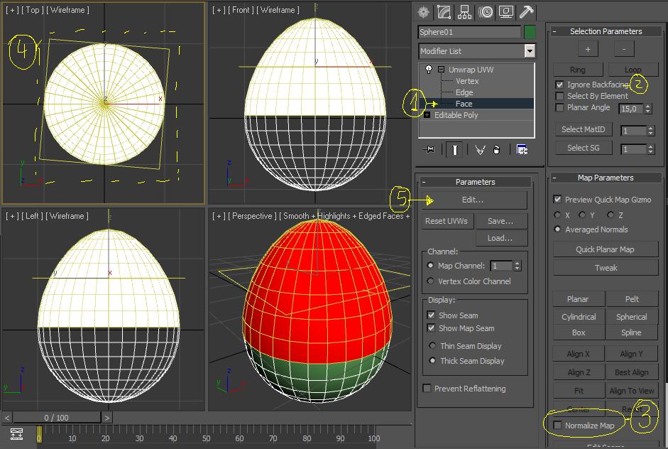 Hola, lo pude hacer con Unwrap, pero ahora no puedo enviarte un tutorial, lo haré en la tarde. Mientras tanto le puedes aplicar a tu huevo un UVW map y seleccionar cilindrical, en el material cargas un bitmap con la imagen cuadrada y la ajustas el UVW map en gizmo, espero te sirva. Saludos.