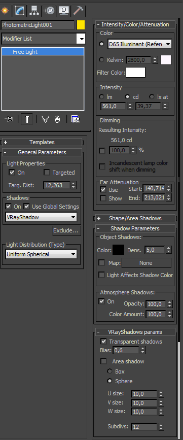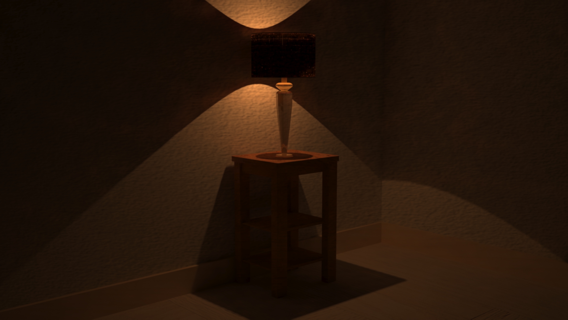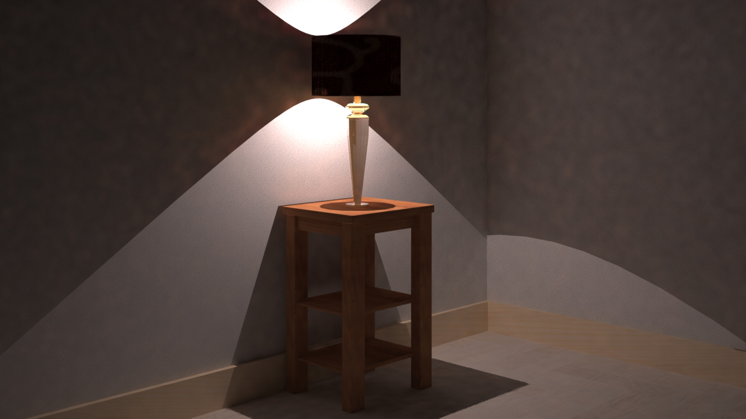 Estas usando una photometricl ight, aunque tenga las Vray shadows habilitada es raro, si puedes usas varias Standards, pero Photometrics no sé por qué te anda, los puntos en la pared pueden ser que te falta Light Cache, trata de no centrar tanto los objetos en la imagen, usa el (rule of thirds) que se usa en fotografía, googlealo, seguí fijándote la escala, la pared se nota mucho el Bump ese o granitos, y no es así. En la iluminación puedes usar las luces de Vray, en la lámpara pdoes usar una IES, usa una imagen HDRI también, en el environment o en una luz dome, o create un semicírculo de ambiente alrededor para usarlo de HDRI y le aplicas un material Vray Light con una imagen que abarque todo el semicírculo, le aumentas la potencia, aunque n definitiva es casi lo mismo que lo anterior, a la lámpara si quieres que la luz atraviese tienes que probar con Vray 2 sided materiales.