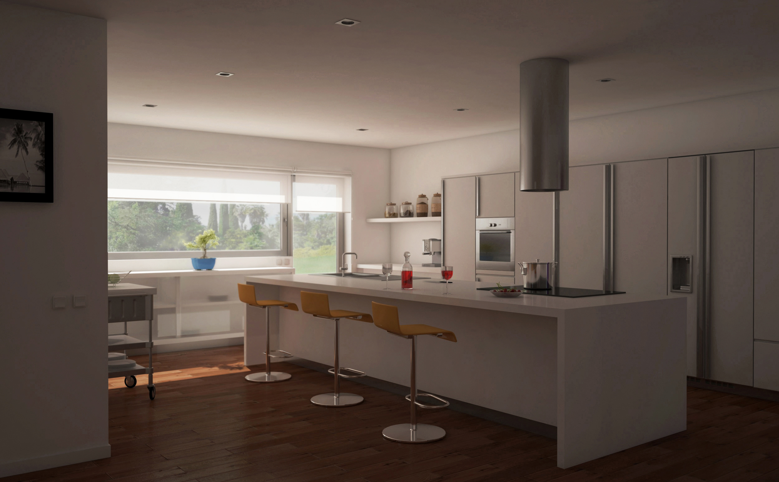 Y la iluminación la veo un poco baja, quizás demasiado oscuro en general. Y para darle más realismo quizás podrías sobrexponer/quemar un poco la imagen de fondo que se ve tras las ventanas de la cocina. Al sacar una fotografía en un interior el exterior se suele ver más quemado. Un saludo, y buen trabajo.