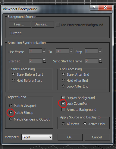 No uses el viewport background. Hazte unos planos con las proporciones de las imágenes que uses como referencia y mételes un material auto iluminado con las imágenes como textura. Los congelas quitándole el show Frozen in grey y listo, se acabaran tus problemas de display y de que te cambie la escala de la imagen cuando menos lo esperas.