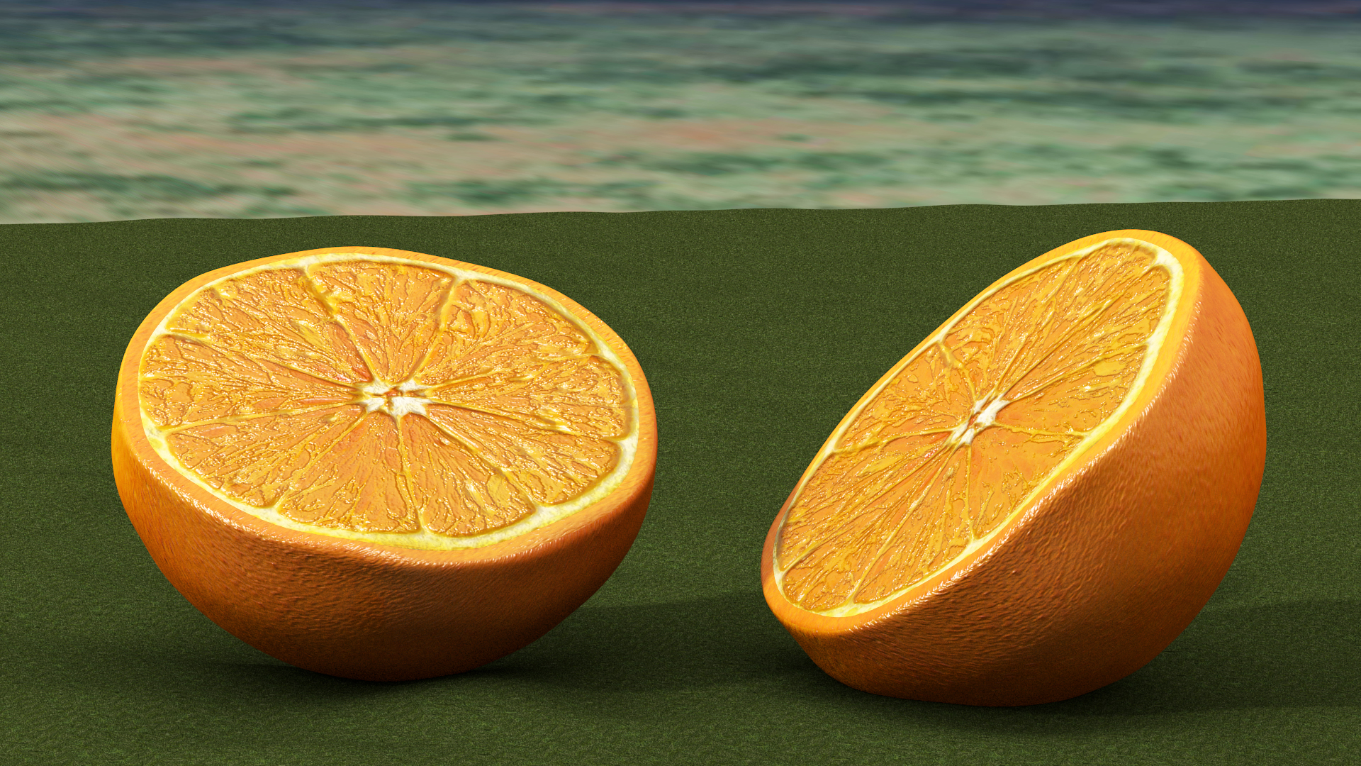 Buenas, no está mal del todo, pero le veo un par de fallos. Cuando cortas una naranja la piel no se dobla hacia dentro, redibuja esa parte. Y segundo le quitas el Bump a la pulpa y usa un poco de desplazamiento aparte de que debes de jugar un poco con el brillo para que de la sensación de húmedo. Un saludo.