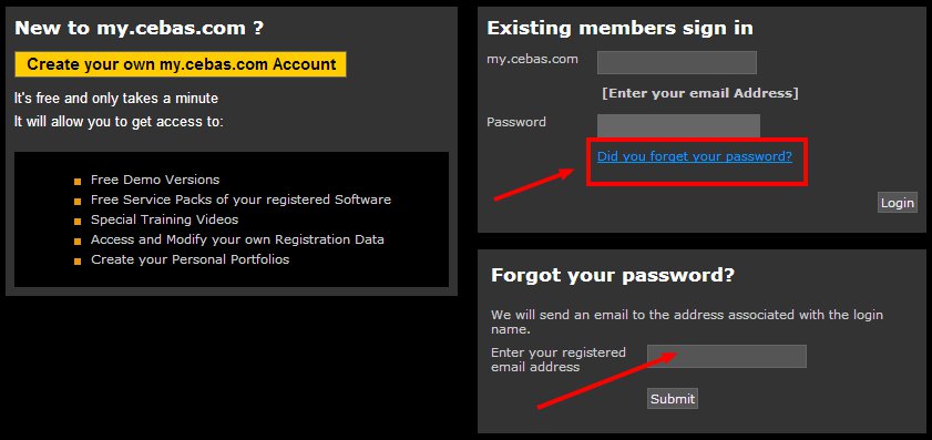No creo que nadie te facilite una cuenta de acceso a Cebas, ya que son personales y cada uno debe tener la suya, además es más que probable que no puedas descargar el mismo software más de una vez ya que son versiones de pruebas, si no lo has descargado nunca, como parece ser ya que no has podido acceder, haz lo siguiente, entra la página de Cebas y ve a la sección de descargas, en ella pulsas sobre did you forget your password? Y seguidamente pones el mail con el que te registraste en el formulario, te lo indico en la imagen:
