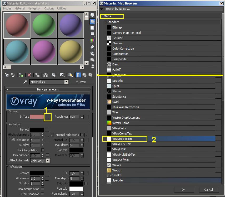 Hola, primero debes dar clic a botón difusse y aquí buscar en mapas el VrayEdgeTex y listo. Lo puedes aplicar a todos los objetos arrastrando a la casilla Override Mtl que está en setup del render Vray(F10). Saludos.