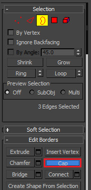 2. Selecciona el borde de tu agujero, ahora baja hasta la persiana edit border y selecciona la opción Cap listo ya tienes el hueco cubierto por un nuevo polígono.