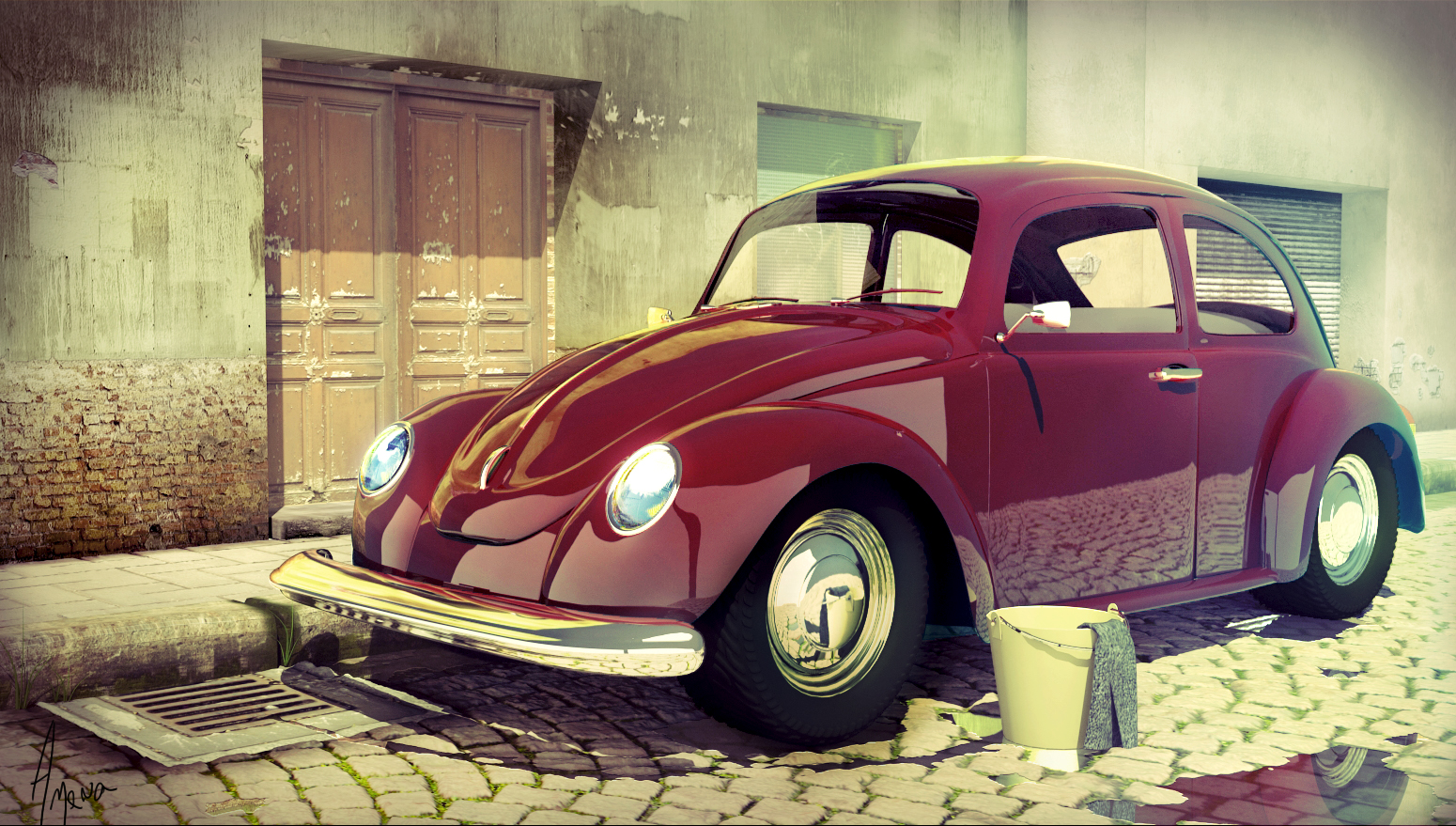 Hola La escena se ve muy bien. Pero el WV tiene errores en el modelado. La parte del capot y los guarda barror delanteros. Son redondeadas y las tuyas son muy planas. Te lo digo que cuando niño lave muchos de este vichos y son redondeadas y hay un modelo 1966 que las luces eran casi integradas a la curvatura de guarrda barro y el 1980 que salió en mí país las luces eran redondas y planas. Saludos