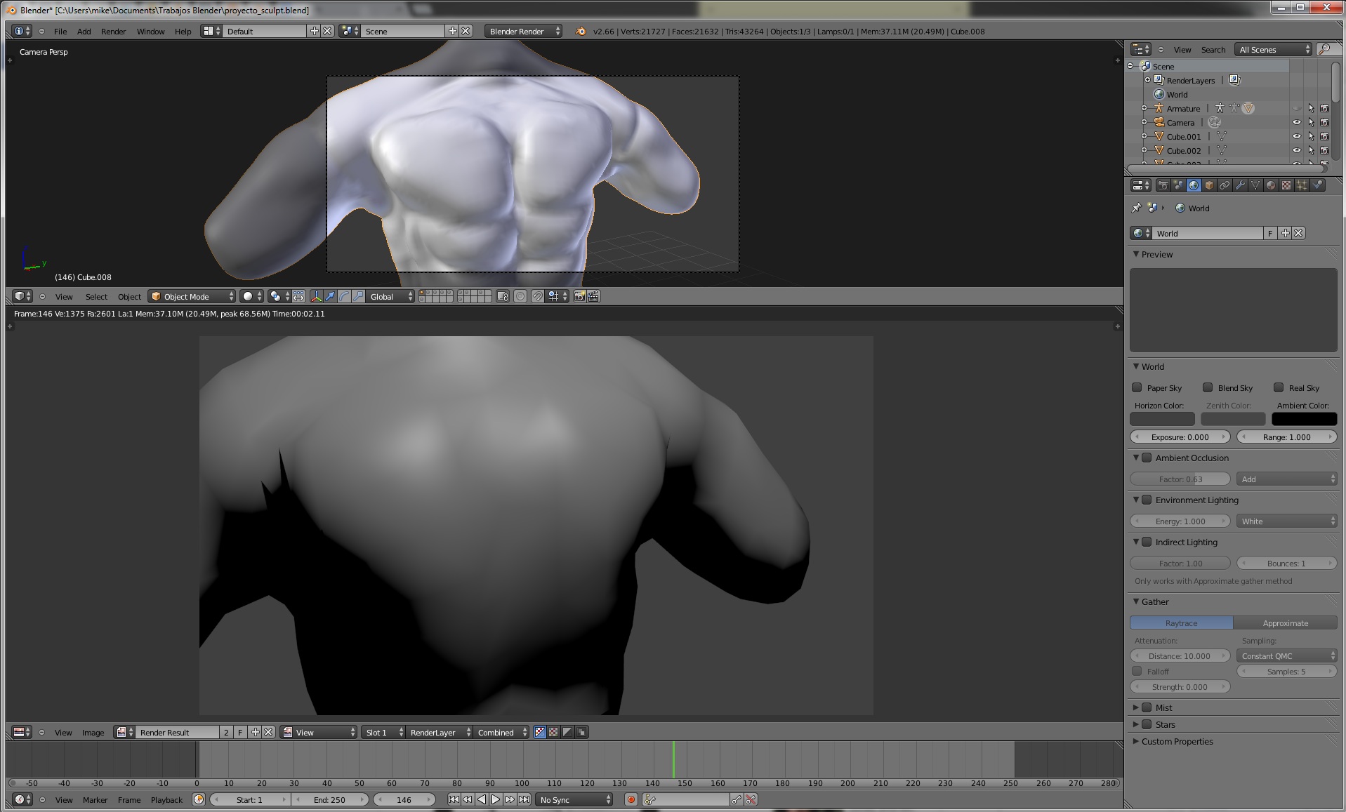 Buenas noches, nuevamente en busca de ayuda, estoy trabajando un busto con Sculpt (mi primera vez usando la herramienta), utilice bones para darle movimientos a los brazos, pero a la hora de renderizar me aparece tal y como.