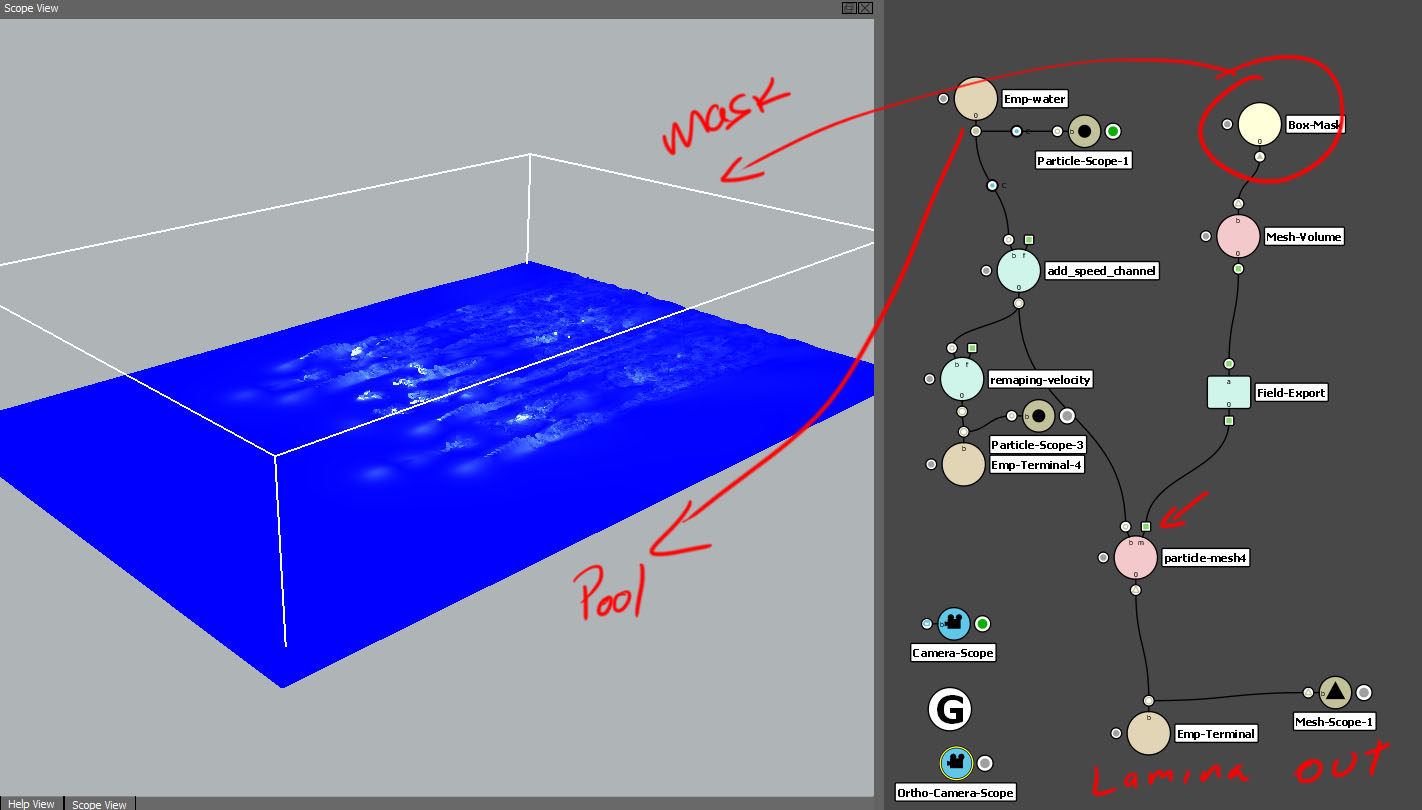 Te refieres el océano con la forma de Realwave no? Es que, agua puede significar muchas cosas, mejor decir el océano. Si te refieres eso, pues es con el nodo Not-Deform, es muy similar al de RealFlow con displacement grid o algo así, es que yo no tengo RealFlow para decirte exacto, deje de usar RealFlow hace tiempo, la lámina qué dices se corta como máscara en el mismo progreso de mesh-particle, en mi caso pongo un cubo en mask y solo simula lo que está dentro del cubo o fuera si lo pones. (te adjunto screen).