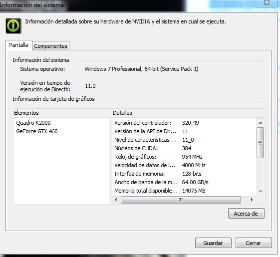 En este caso se trata que mantengo la misma configuración de PC con 2 tarjetas de video: GTX 460 y la Quadro k2000.