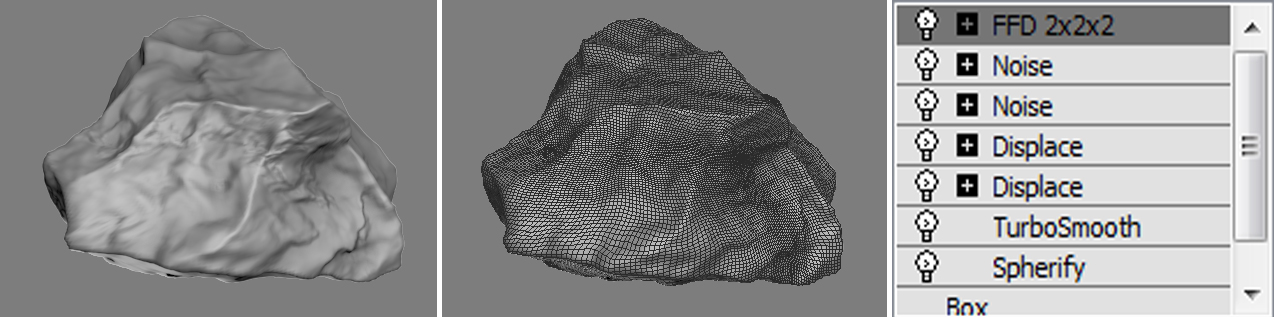 Hola chicos, acabo de hacer una roca con varios modificadores en 3Ds Max, el objeto es muy pesado con una gran cantidad de polígonos. Las deformaciones de roca se ven de forma física. Es posible convertir esta roca en otro objeto con pocos polígonos y transferir todas las deformaciones físicas en mapas de textura displacement para qué el objeto con la forma básica de bajos polígonos se le pueda aplicar el mapa de displacement y obtener el mismo resultado, pero sin tanto peso. Adjunto una imagen del objeto junto a todos los modificadores que he usado. Como pueden observar el objeto roca de la izquierda tiene deformaciones físicas, la imagen del centro muestra la gran cantidad de polígonos y la de la derecha los modificadores o efectos utilizados. La pregunta como lo dije es: ¿Cómo transformar esta roca en otro objeto más básico con poca cantidad de polígonos y transformar todas las deformaciones físicas en un mapa de displacement, algo, así como lo que ocurre en ZBrush. Sé que es posible porque vi una imagen por ahí en Internet, pero no logro conseguir siquiera un tutorial. Saludos y gracias.