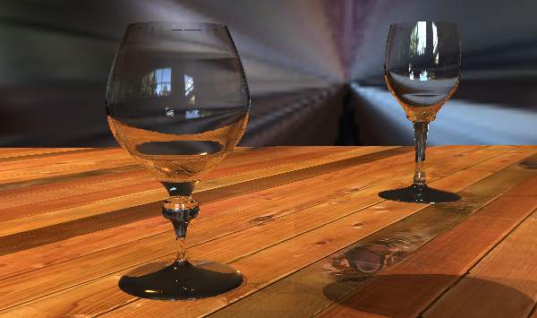 La reflexión frontal de las copas se ve demasiado, prueba a poner reflexión Fresnel para lograr un efecto más real (más reflexión en los lados y menos frontal). Tiene razón, las copas refractan mucho. El IOR del vidrio esta entre 1,50 y 1,7, compruébalo.