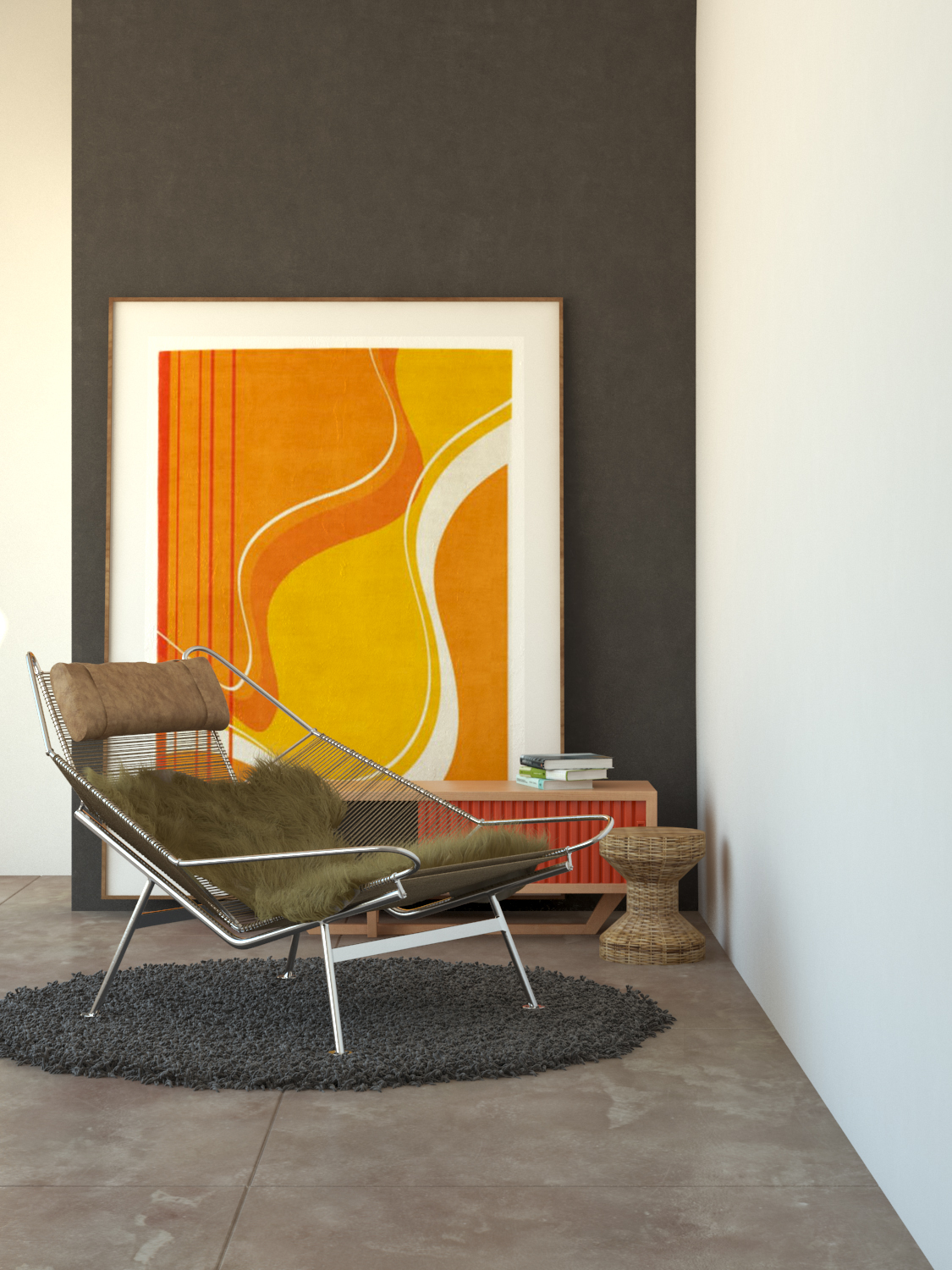 Como te comentan esta todo muy correcto. Yo personalmente habría puesto el sillón girado hacia el lado contrario, ahí parece que estés castigado contra la pared y el puf de caña se ve muy plana la textura, parece que esté envuelto con papel decorativo. Saludos.