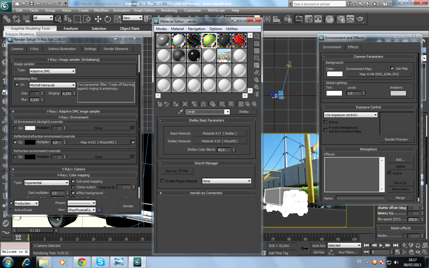Buen día amigos del foro 3d poder es primer vez que pido ayuda en el foro espero se claro para una solución a mi problema. Estoy trabajando una escena en la cual quiero integrar una fotografía con un carro 3d, lo estoy haciendo de la manera habitual es decir poniendo mi fotografía en el environment y en el viewport, escale la resolución de salida del mismo tamaño de la fotografía, y puse los materiales a mi objeto materiales metálicos de carro, lo que sucede a continuación es que cuando género el render mis materiales parecen tomar transparencia y tratan de asimilar el environment de la fotografía adjunto imágenes para quien tenga conocimiento me ayude, estoy usando Vray una luz target direct con Vray shadows.