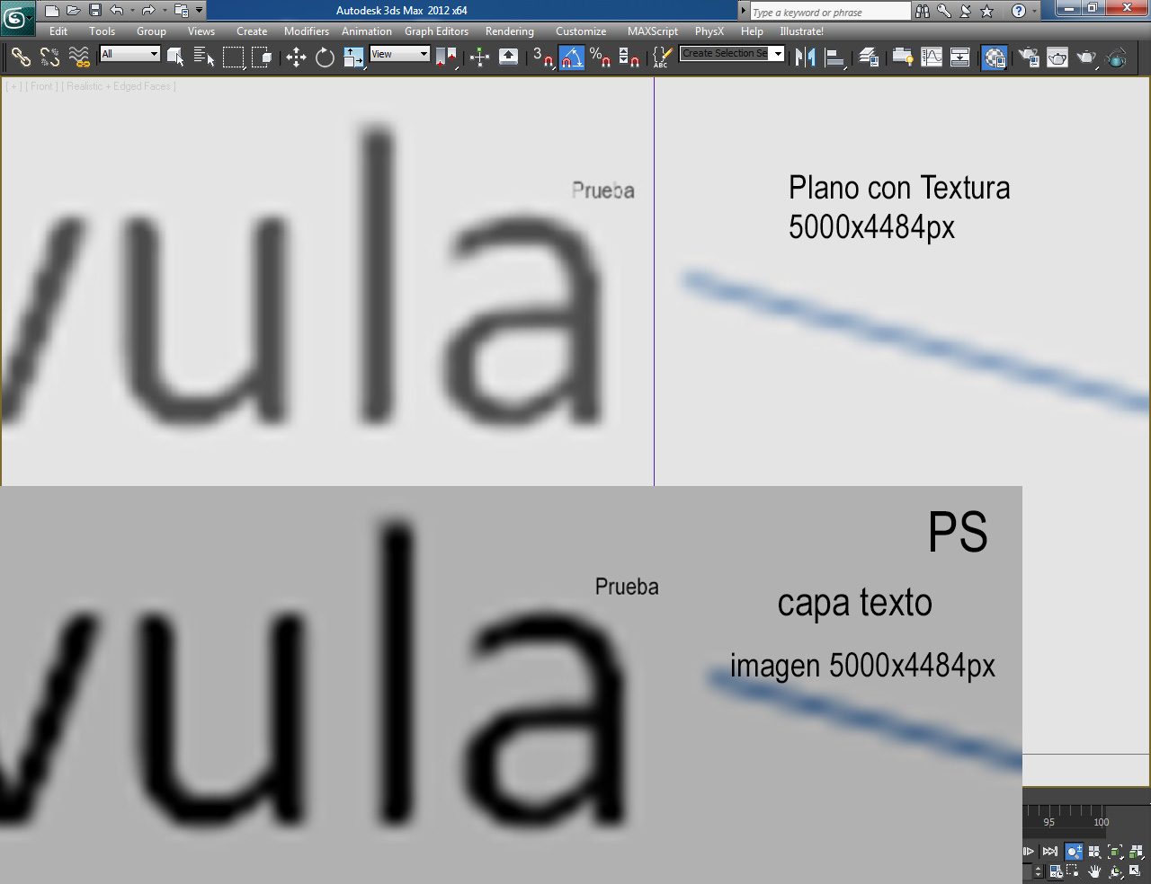 Te adjunto dos composiciones con pantallazos en el 3DS Max y PS con una textura a dos resoluciones diferentes y se puede ver perfectamente cómo se representa el texto en el viewport con la resolución de 5000px.