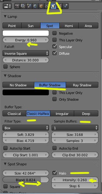 Estos son los parámetros que he usado en el foco principal y en la luz ambiental. Las demás luces son rebotes a baja intensidad y alguna para aumentar un poco el brillo (delante). El halo parece que no se nota y no consigo suavizar más los bordes de la lámpara principal.