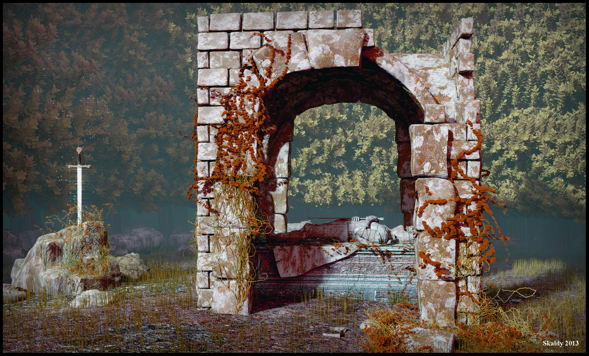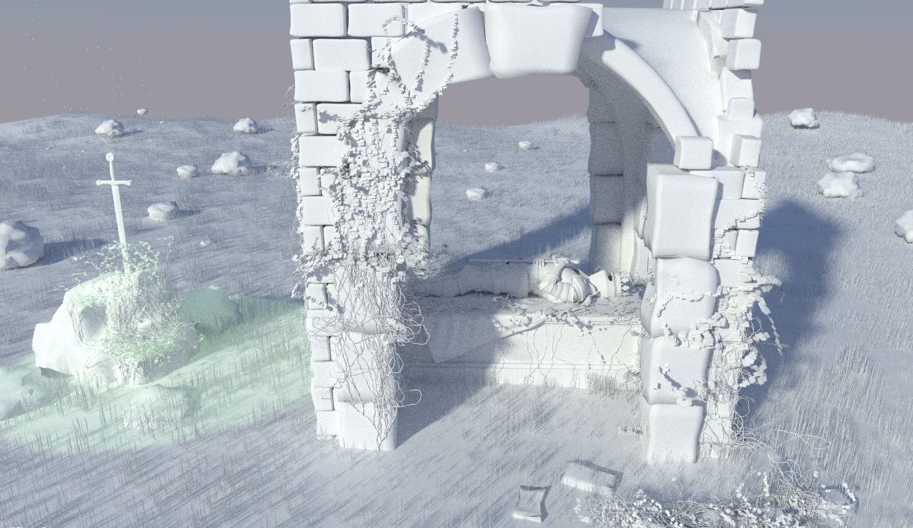 Tiene muy buena pinta en general, pero, las hojas de las enredaderas son cuadrados. Y, además, se nota demasiado y es una pena, deberías arreglarlo, porque es muy fácil. Es cuestión de seleccionarlas todas, Unwrap, reset, y buscarte cualquier textura de una hoja y usar el alfa para recortar esos cuadrados. Y si además usas una hoja para texturizarlos, consiguiendo diferentes tonalidades rojizas, mejor. La escena tiene buena estética general, pero creo que eso que te digo lo afea demasiado.