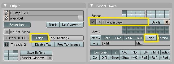 Una vez ya tenemos la escena vamos a marcar el botón Edge de la pestaña Output, y a su vez vamos a desmarcarla de la ventana Render Layers.