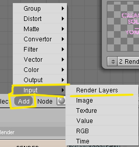 Ahora nos vamos al Node Editor presionamos la carita de Composite Nodes, y el botón Use nodes. A la escena de nodes que sale, hay que añadirle otro Render Layer. Para ello presionamos Add > Input > Render Layers.