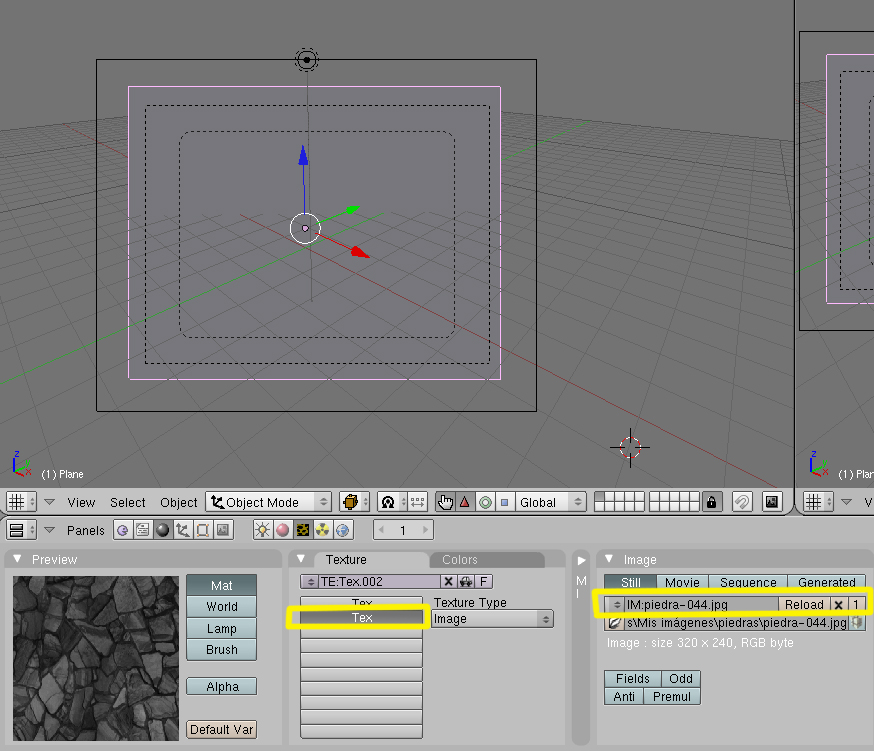 Vamos a crear una escena sencilla (un plano, por ejemplo) y le vamos a poner dos texturas de tipo imagen.