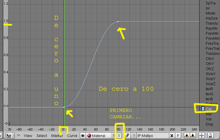 Seguidamente presionamos la opción COL y nos situamos con el ratón sobre las coordenadas =0.0 y 0 y presionamos Ctrl+BotónIzquierdoRatón; luego lo situamos sobre las coordenadas 1.0 y 100 y volvemos a presionar el Ctrl+BotónIzquierdoRatón. Podríamos hacer lo contrario, que sería 1.0 y 0 --0.0 y 100 para qué fuera el efecto al revés, pero no la vamos a liar ahora.