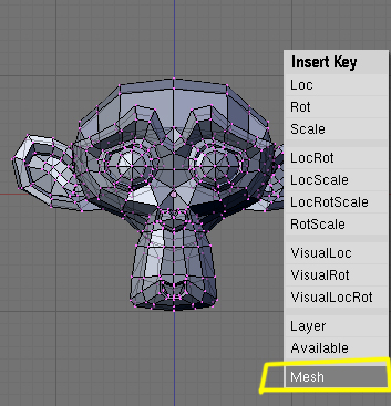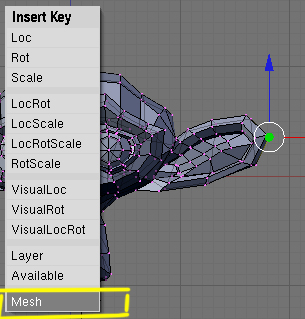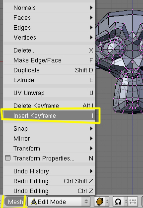 Ahora vamos a insertar el primer Keyframe; esto se puede hacer como en la imagen, Mesh > Insert Keyframe, o simplemente presionando la letra I.