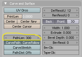 Si ahora presionamos Alt+A el cubo debe de hacer el recorrido de la curva en 100 Layers. Para cambiar el tiempo (layers) de recorrido, podemos seleccionar la curva Bézier, presionar F9 y en la ventana Curve and Surface podemos cambiar el valor PathLen al valor que nos interese. Recordar que se ha de cambiar también para él Render final (F10 ANIM End:***).