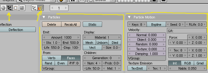 Ahora viene el material y el efecto de partículas. Para ello seleccionamos el cubo presionamos F7 y Physics Buttons creamos un nuevo efecto de partículas NEW y ponemos los siguientes valores.