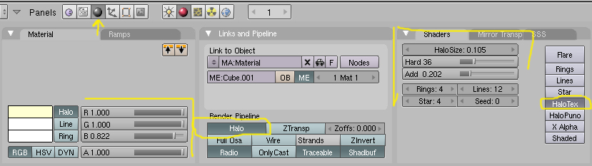 En materiales, debemos presionar el botón Halo, poner los valores de color, los de Shaders y presionar HaloTex.