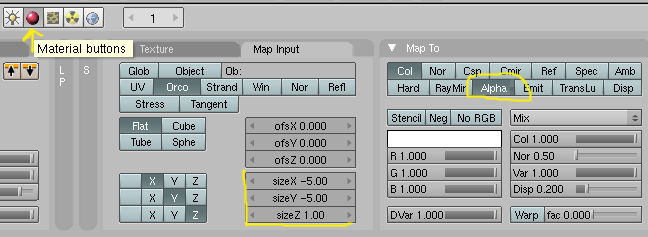 Volvemos a materiales F6 y en las ventanas Map Input y Map To ponemos los valores y presionamos Alpha como en la siguiente imagen.