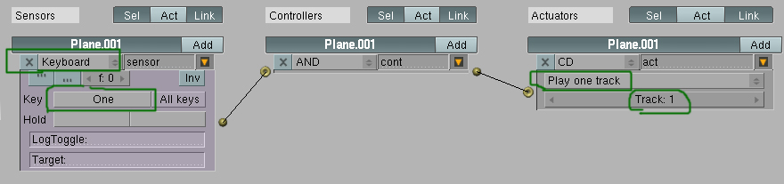 En el Blend que he hecho, he colocado tres letreros trak y a cada uno le he puesto un valor. En este caso se trata de que cada vez que quieras reproducir uno de los tracks, solo tienes que presionar la tecla del número que desees. Como se ve en la imagen, cuando presionas 1 se activa el CD trak 1.