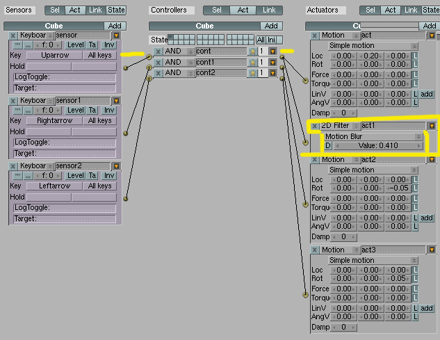 En la misma flecha arriba, le he colocado también el Actuator 2D Filter con la opción MotionBlur seleccionada; para qué cree el efecto cada vez que se mueve.
