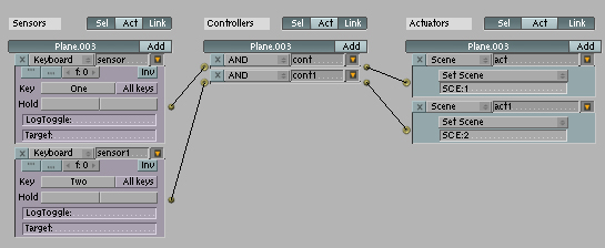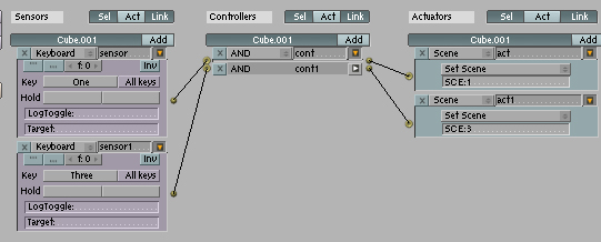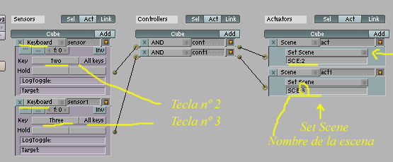 Como se ve, he colocado la opción de que cuando se presione el botón del número dos se abra la escena llamada 2, y lo mismo con la otra, tecla de número tres abre escena 3.
